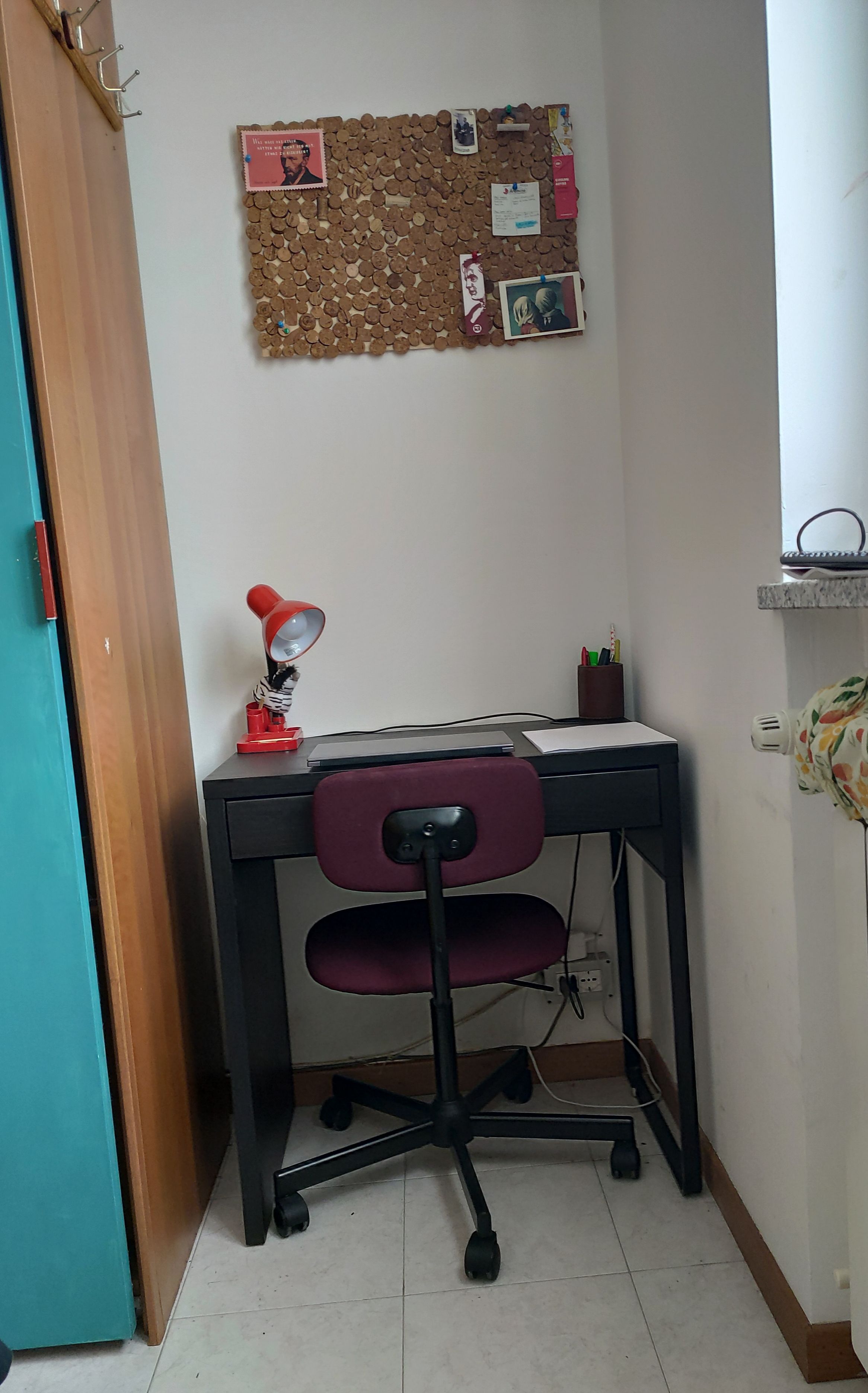 Parte integrante della scrivania è il soffitto: non quello vero, alto, quello sarebbe troppo per me. Il mio soffitto, quello un metro più in su: una bacheca di fortuna tutta insugherata per poterci crocefiggere meglio le questioni. E che questioni, tutte importanti. In alto a destra un segnalibro di Arpino: ad Arpino voglio bene perché si è inventato la pioggia in un passo bellissimo (Si vide i calzoni macchiati d’acqua e allora gli raccontai la pioggia in Sei stato felice, Giovanni) e ha raccontato ne La suora giovane un amore senza possibilità. I segnalibri per me sono stati sempre molto importanti: fino a pochi anni fa non avevo la possibilità di comprare libri, il segnalibro era una promessa d’acquisto intima, un sogno.