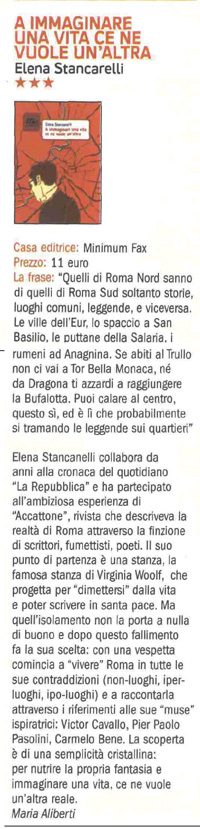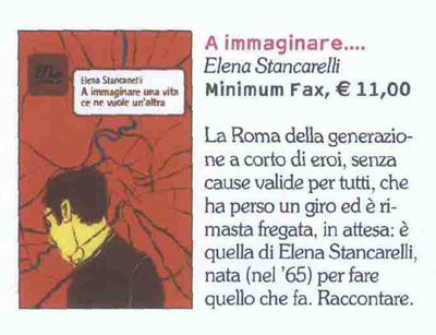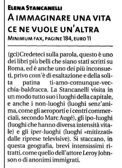 Elena Stancanelli has taken a journey through the memory, the art, and the imagination of Rome, but above all, she puts herself at risk, in person, as she takes on, unmasked, the life (and the vitality: variously languid, or ferocious, or despairing) and the encounters and the stories that keep the city going. The result is a narrative mosaic whose strongest feature is the missing tiles: not a rigid claim to totality, but instead the all-encompassing thunderstruck description of an authentic experience.