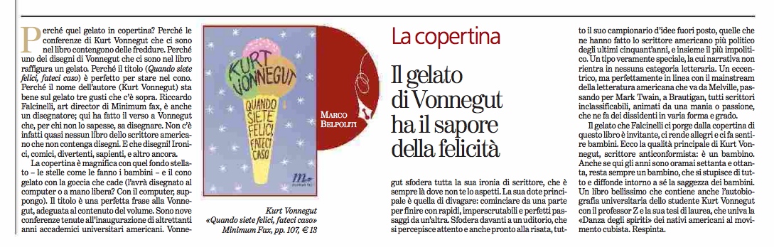 Riccardo Falcinelli sulla copertina del libro di Kurt Vonnegut: «E poi cioccolato e fragola sono un'accoppiata, giocosa e spregiudicata, che fa tanto Stati Uniti.»Leggi