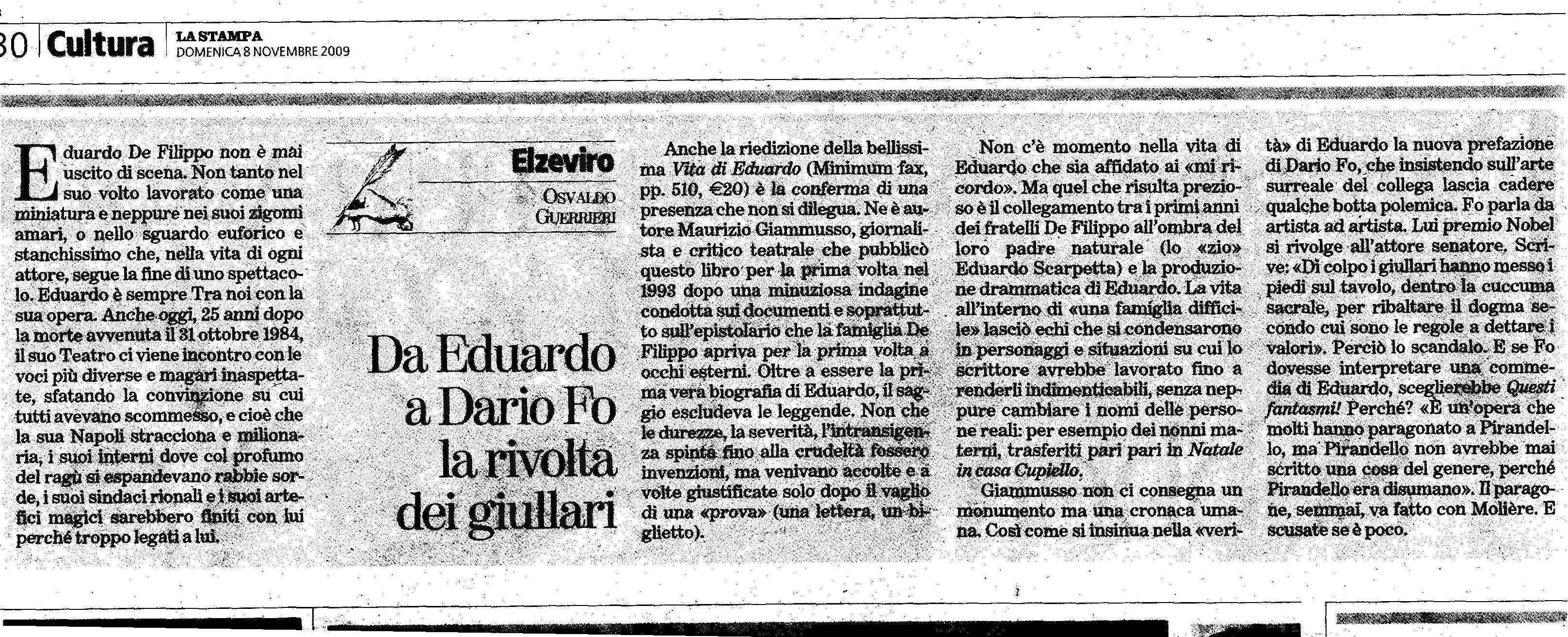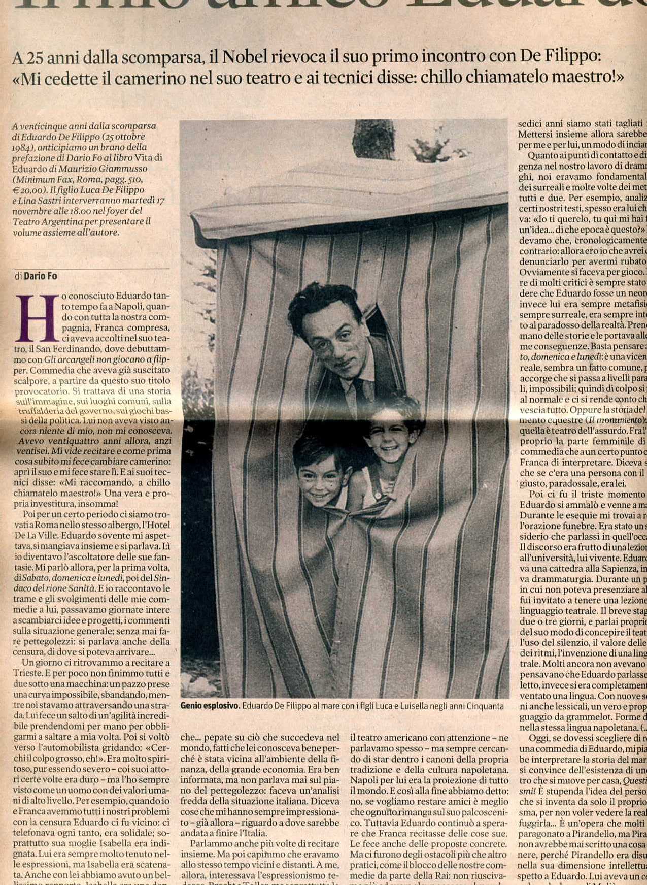 Italian playwright Dario Fo, winner of the Nobel Prize for Literature, contributes a brief essay about his personal and artistic relationship with De Filippo.