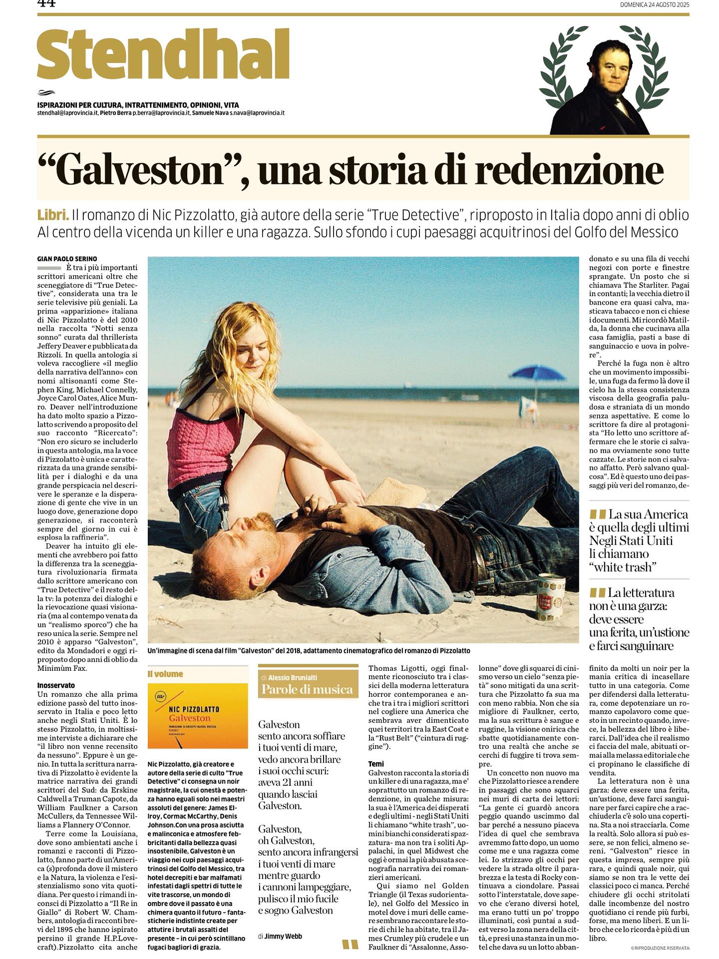 Con una prosa asciutta e malinconica e atmosfere febbricitanti dalla bellezza quasi insostenibile, Galveston è un viaggio nei cupi paesaggi acquitrinosi del Golfo del Messico, tra hotel decrepiti e bar malfamati infestati dagli spettri di tutte le vite trascorse, un mondo di ombre dove il passato è una chimera quanto il futuro – fantasticherie indistinte create per attutire i brutali assalti del presente – in cui però, come miraggi esalati dal calore della roccia in un deserto, scintillano fugaci bagliori di grazia.