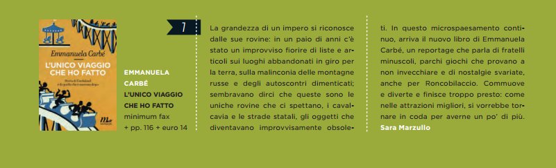 Nell’Unico viaggio che ho fatto Emmanuela Carbé racconta con acume e passione Gardaland, il nonluogo del divertimento che si ostina a restare un posto reale di persone vere e belle, racconta l’infanzia perduta tra nostalgia e sollievo e il nostro quotidiano che non s’incastra mai nei desideri e nei sogni, trovando infine un momento di felicità perfetta in un luogo che è, allo stesso tempo, la meta e l’inizio della fuga.