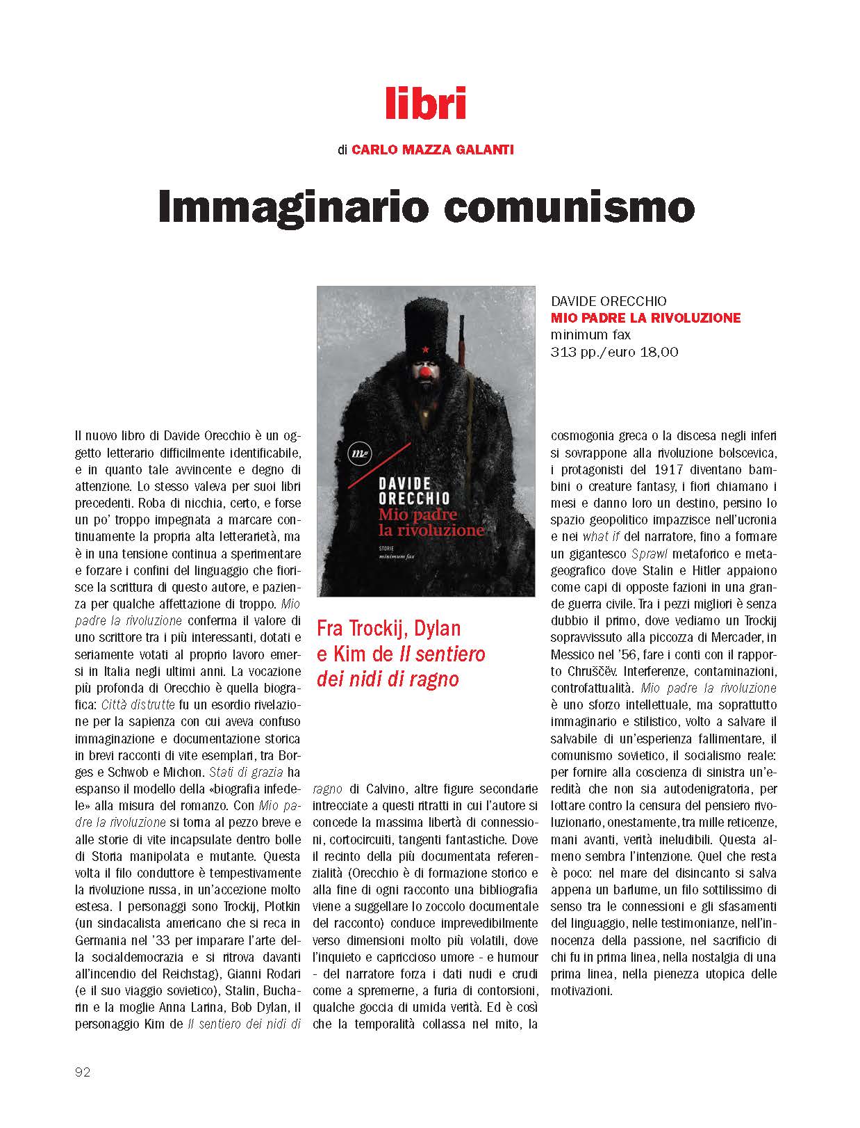 Il tentativo più vertiginoso di saldare fra loro letteratura e Storia, al punto da dissolvere la seconda nella prima, rimane quello compiuto da Davide Orecchio in "Mio padre la rivoluzione".Leggi