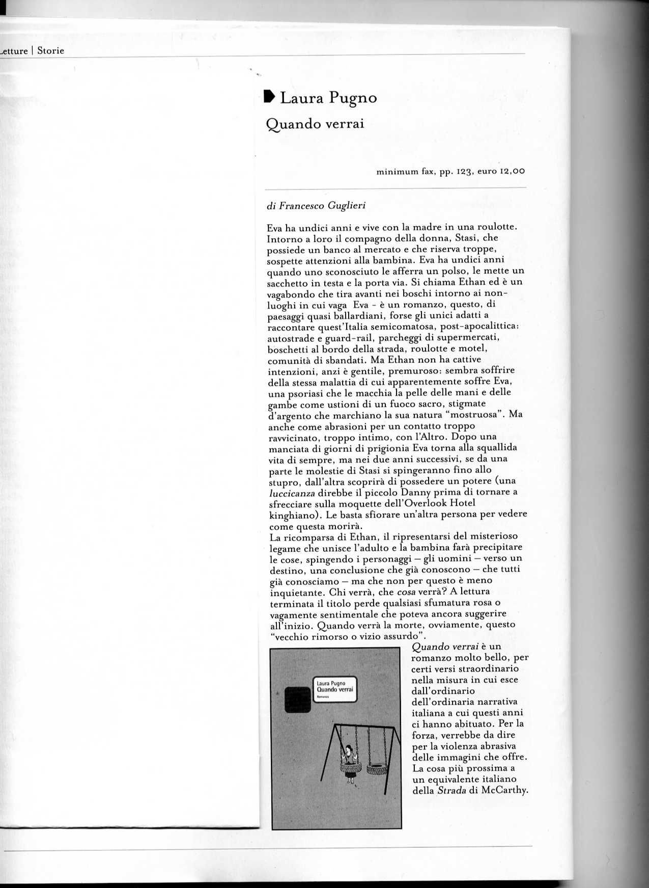 Appassionante, crudele, elegante, Quando verrai è una stupefacente prova narrativa in cui il fascino struggente del romanzo di formazione si unisce alla potenza visionaria della letteratura fantastica, sorretti da una scrittura incalzante, viva e modernissima. Il secondo romanzo di Laura Pugno – una delle migliori voci dell’ultima generazione letteraria – sceglie insomma una prospettiva totalmente nuova attraverso cui raccontare i temi universali dei riti di passaggio e della scoperta di sé.